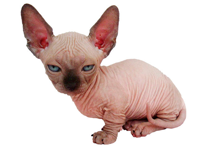 - Characteristics of the coat: almost without hair, some specimens are completely bald while others have very short hair (like peach fuzz)